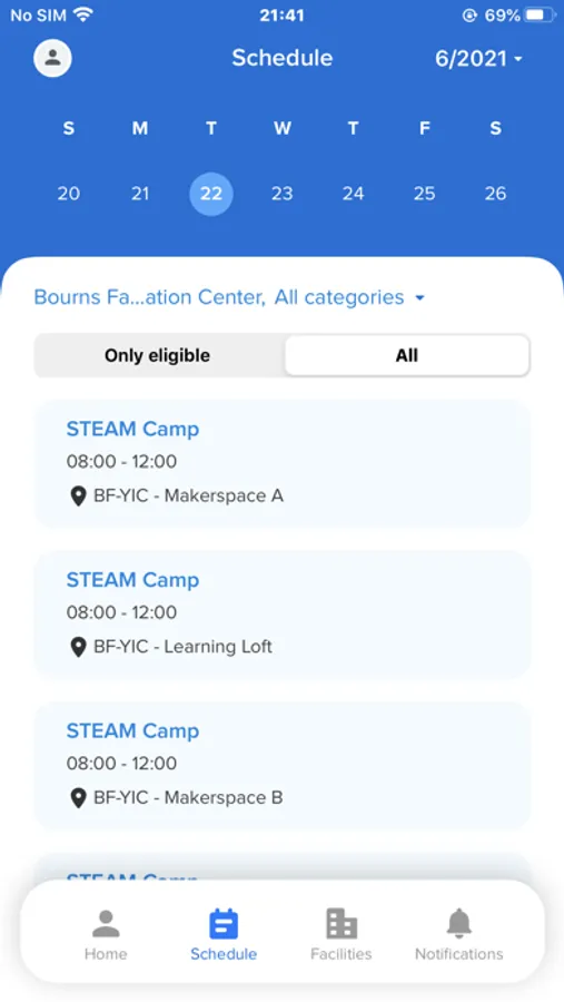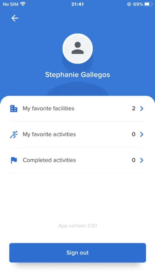 on the profile page, view your favourite facilities, favourite activities and completed activities.