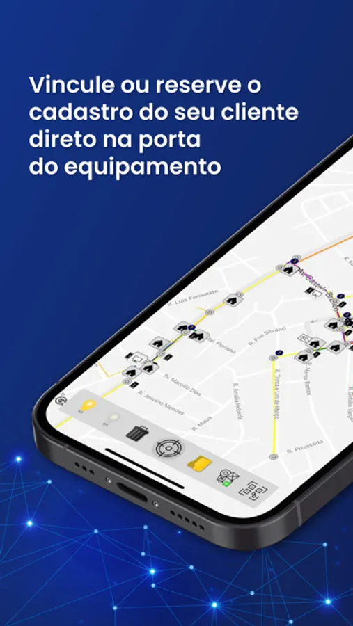 - Cadastro de rede: Cadastre os itens da rede de forma rápida e simples de entender. Postes, reservas técnicas, caixas de emenda, equipamentos, conexões, fusões, além de terminais de atendimento e clientes;