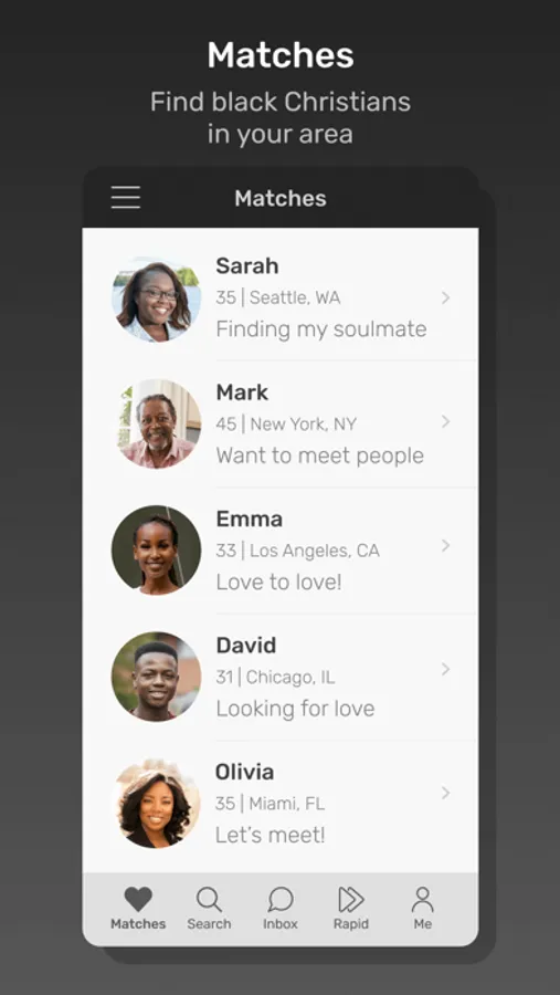 The Black Christian Soulmates dating app is for people of faith who love church. Whether your a senior black Christian looking for love or someone new to the religion, we have thousands of single black Christians you can find.