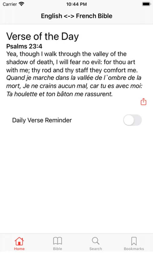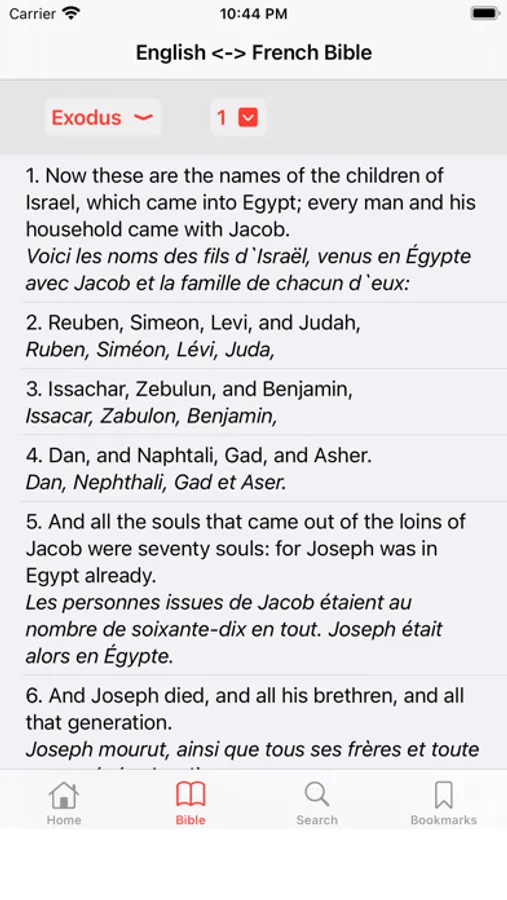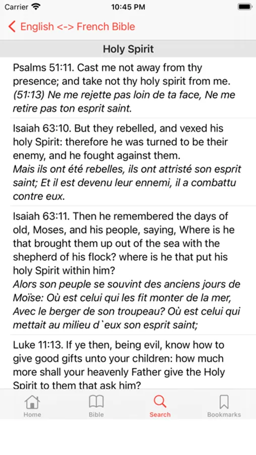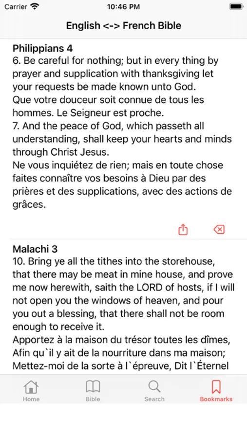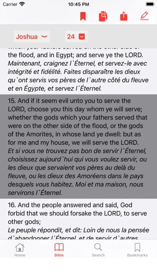 An English with French parallel version Holy Bible that is completely offline. This is the only Bible app you'll need when attending a church service or personal devotion. You can highlight, copy, bookmark or share verse(s).