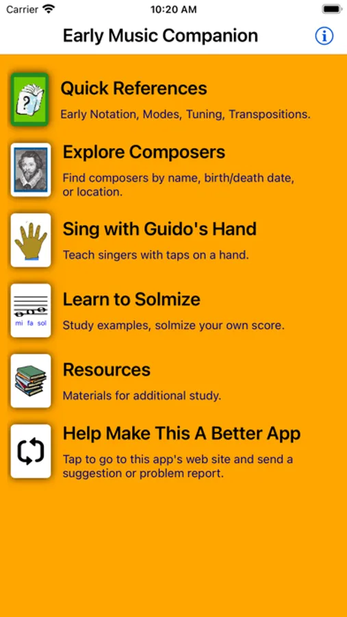 Early Music Companion is a tool for historically informed performances of late Medieval and Renaissance music. Features include an active Guido's Hand, a composer database, a solmization tutor, and quick references for early notation, modes, and clef transformations.