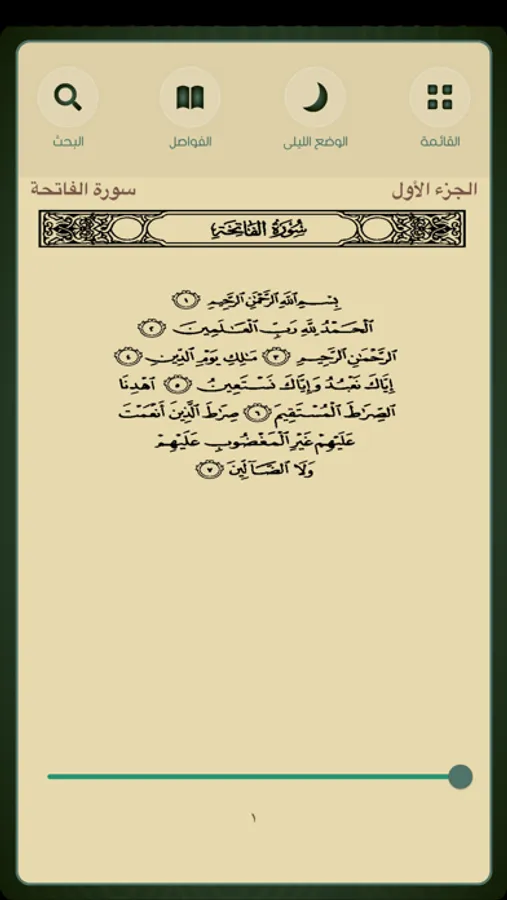 6- في هذا التطبيق ستتمكن من المرور على جميع صفحات المصحف في وضع القراءة باستخدام شريط حركة أسفل الصفحة موضح فيه كامل بيانات الصفحة التي يشير إليها الشريط