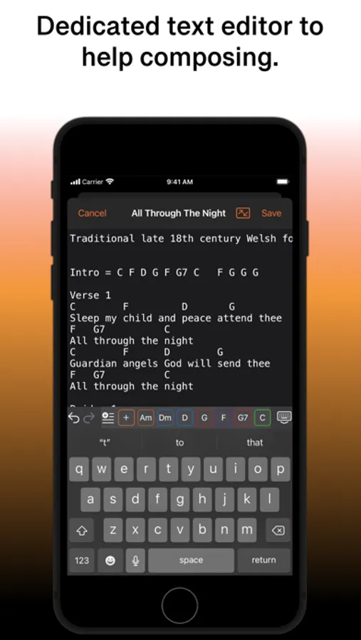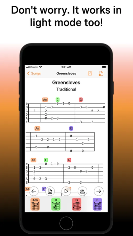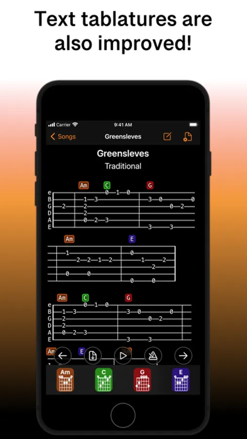 With SongFolio, you can easily create your chord diagrams and tablatures of your compositions or quick ideas in text format that is transformed into a performance view!