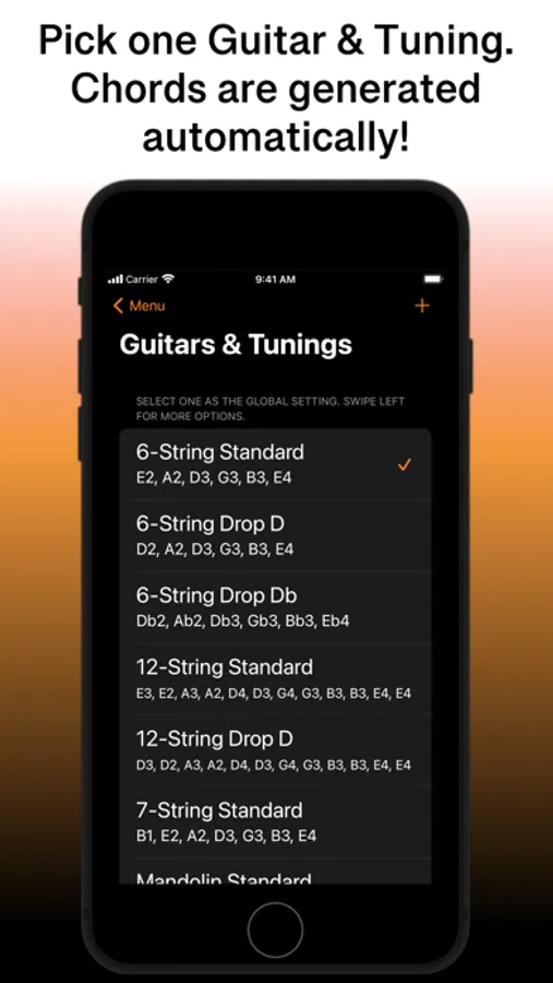 - Select guitar type and tuning for all songs (6-String Guitar, Ukulele, Mandolin, …). Chords diagrams are generated automatically accordingly!
