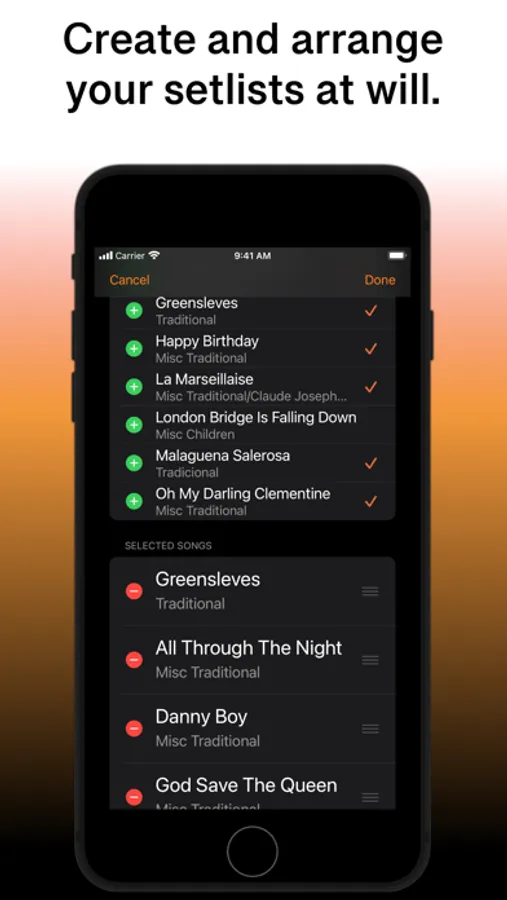 Create your Setlists for practicing, rehearsing and even performing on stage.