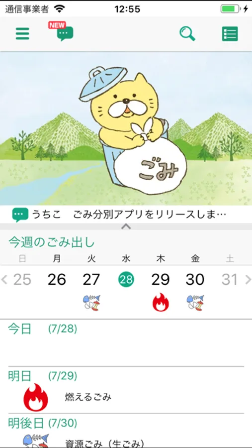 収集日変更のお知らせやイベント情報などを確認することができます。