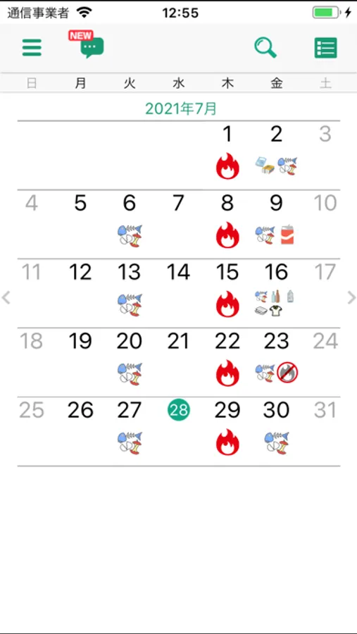 今日と明日、週ごと、月ごとの3パターンによるごみ収集日程を一つの画面ですぐに確認することができます。