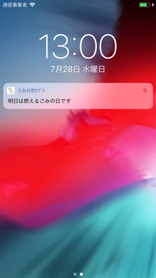 収集予定のごみ種別を前日と当日にアラートでお知らせします。時間は自由に設定することができます。