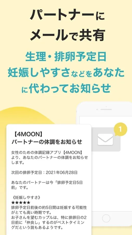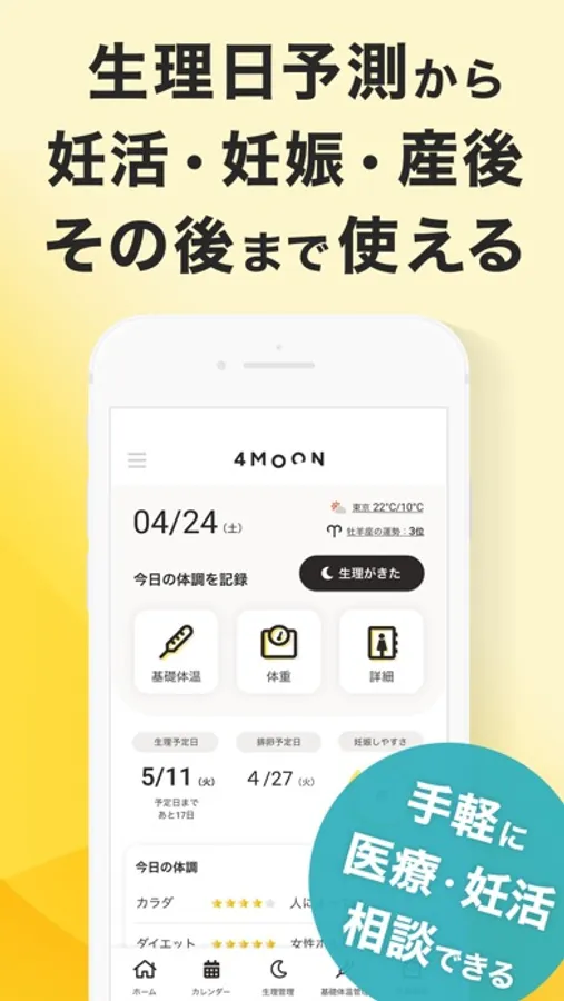 人気急上昇中!生理日予測や生理周期などの生理管理、妊活に便利な排卵日予測や基礎体温グラフ、パートナー共有、妊娠の可能性(妊娠しやすさ)の表示、TDK婦人用電子体温計(基礎体温計)とアプリ連携でデータ転送、婦人科系以外の体調不良にも使える体調記録管理、ダイエットや日々の体重管理、予定と生理日予測などが一目でわかるスケジュールカレンダーが4MOON(フォームーン)では無料です。