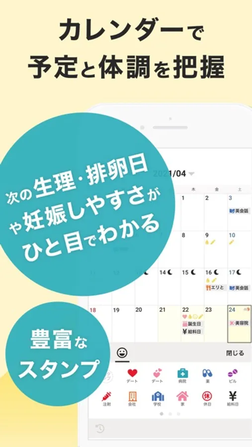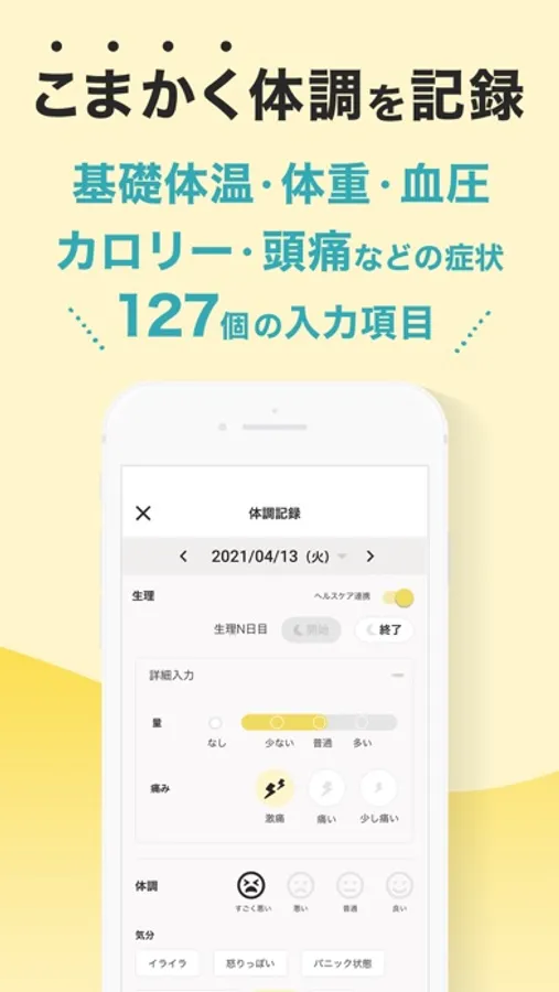 生理がないときは生理日予測をオフに。体重管理、避妊、血圧、ダイエット、食事カロリー、頭痛など諸症状の体調管理や予定管理をカレンダーで。ピル服用後や更年期障害など不安を感じたらオンライン医療相談も。