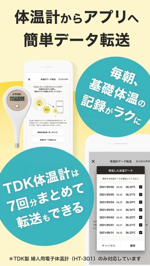排卵日予測と妊娠の可能性(妊娠しやすさ)をチェック。排卵日予測にあわせてパートナー共有も。基礎体温や排卵痛なども記録OK。TDK体温計と無料アプリ連携すると基礎体温の記録がラクに。基礎体温グラフを保存、印刷して婦人科で排卵検査時に医師相談も。