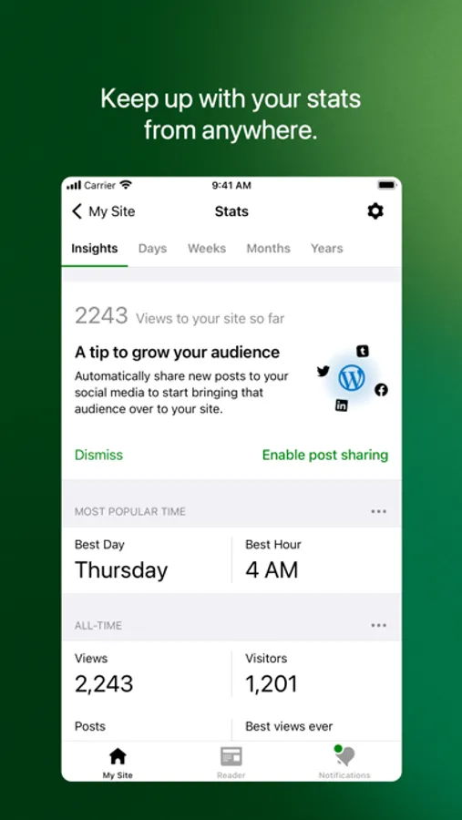 Track which posts and pages get the most traffic over time by exploring daily, weekly, monthly, and yearly insights.