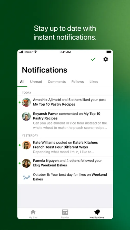 Get notifications about comments, likes, and new followers so you can see people reacting to your website as it happens.