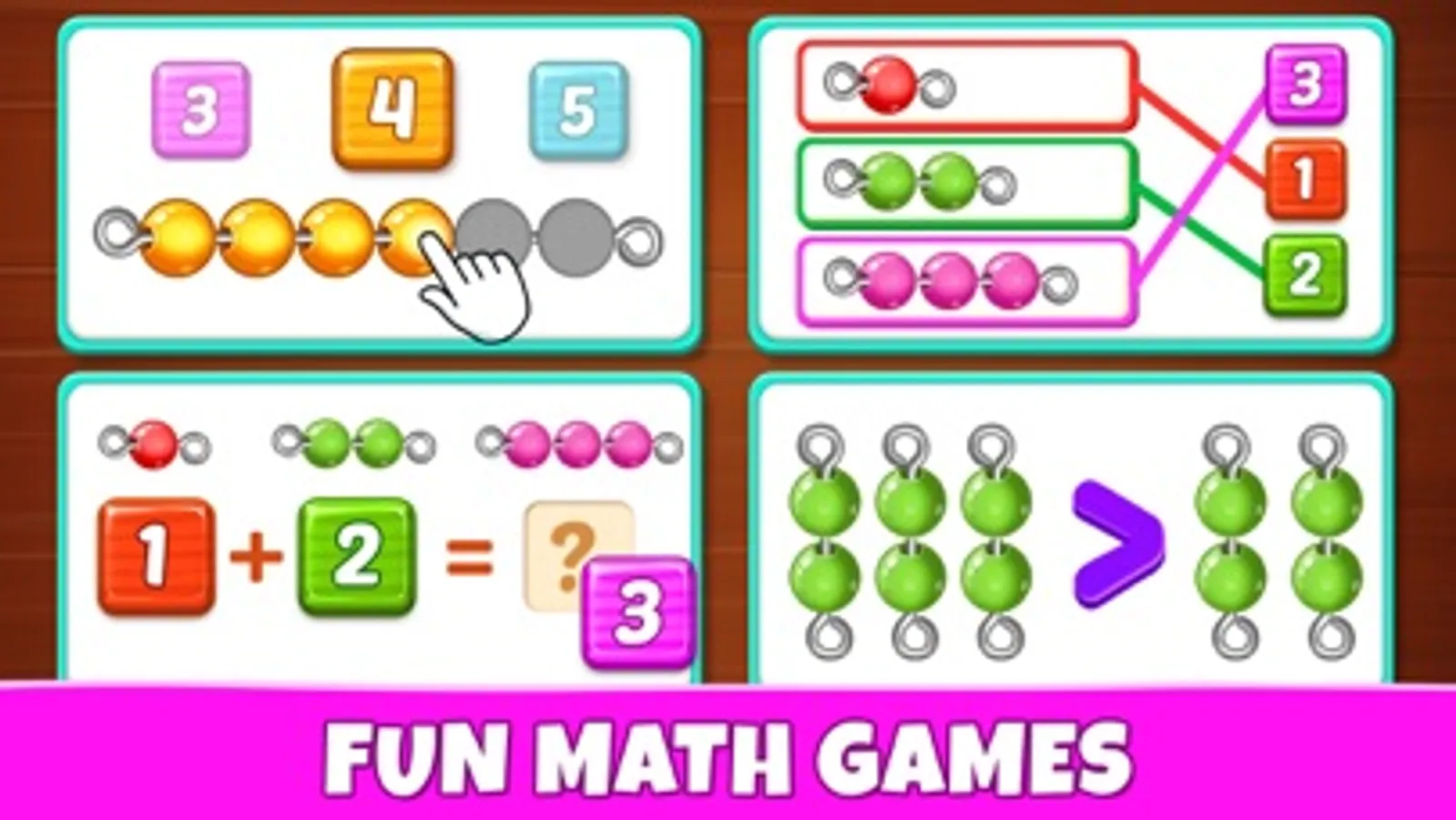 Kids can learn counting and math skills using the time-tested beads method. Choose between various math exercises for kids, then watch how quickly your child learns! Games in this mode include counting exercises, learning place values (ones, tens, hundreds), and simple math operations like adding and subtracting.