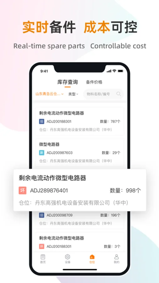 Spare parts adopt enterprise - warehouse - position management mode, support enterprise/individual multi-level spare parts management. It can realize the backpack material spare parts automatically occupying and releasing the warehouse position, and realize spare parts service at low-cost, through report analysis.
