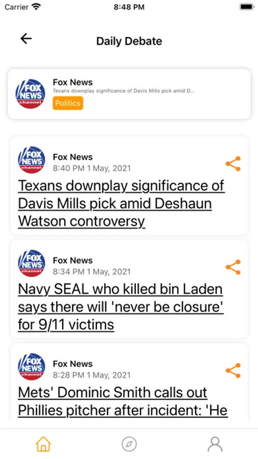 The Daily Debate website and app allow you to pick and choose the news you want to see in realtime. Whether it be CNN or FOX you're in control. Just sit back and watch your headlines scroll by. Just simply create a user, log in and start creating your customized news feed. It’s that easy!