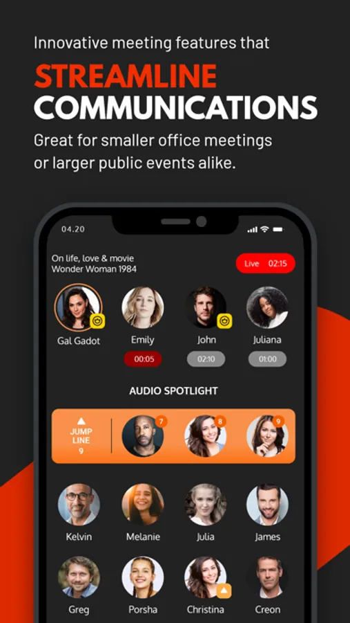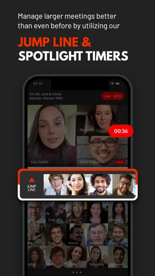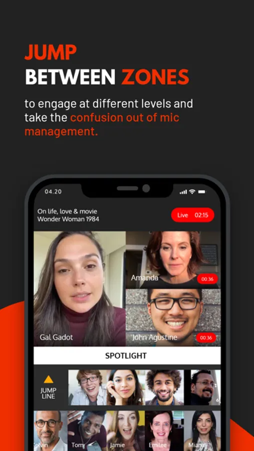 JUMP: Audience members can then easily JUMP to the Spotlight to speak and then JUMP off when finished, thereby eliminating all the mic confusion that often occurs in virtual gatherings.
