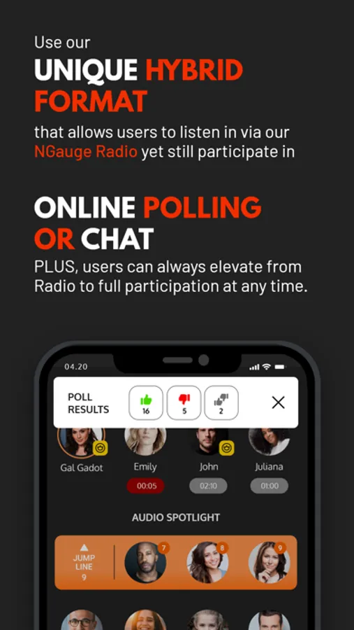 NGauge Radio (Audio-only): This is our Audio-only format that eliminates video from the equation, while still maintaining all the powerful features that NGauge has to offer. This includes our JUMP, JUMP LINE, chatting, polling, Spotlight timers, recording, monetisation, and fundraising.