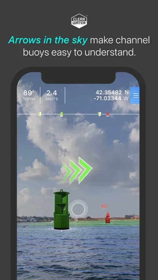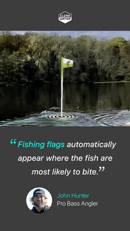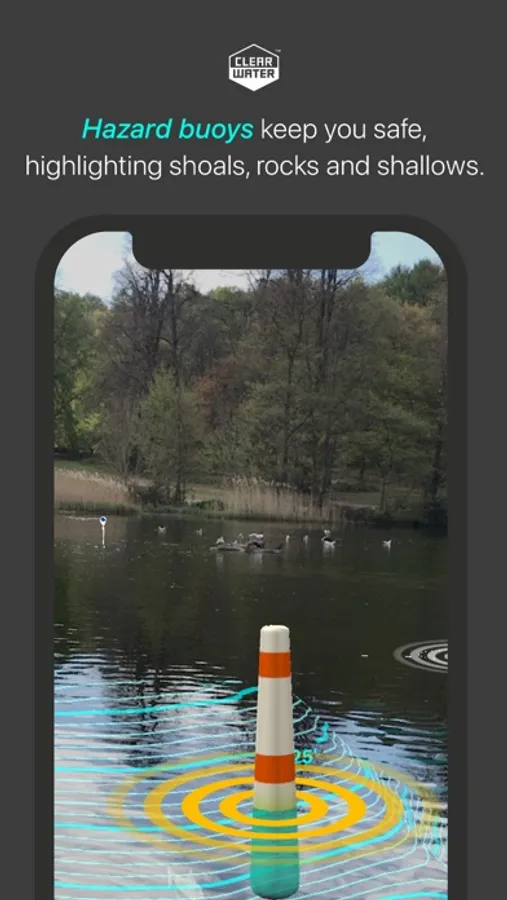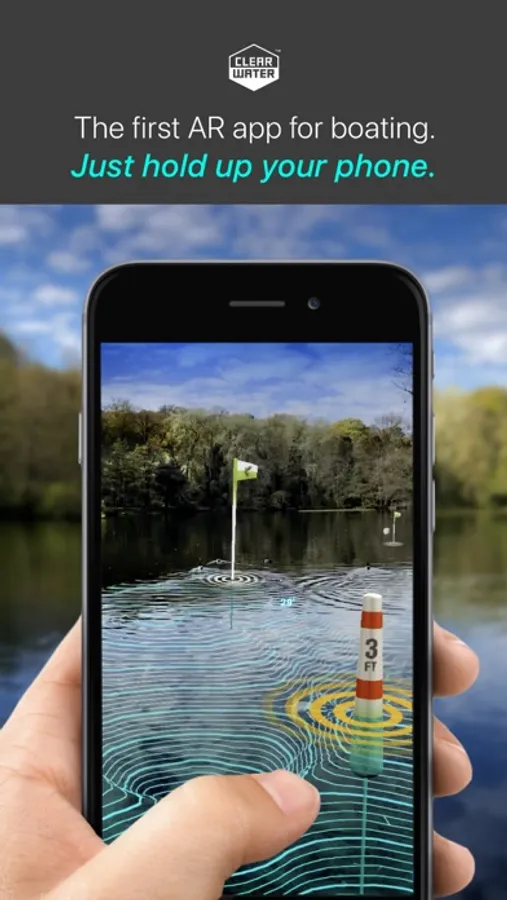 ClearWater projects 3D topo maps with augmented reality to make the water appear transparent to reveal structure and terrain directly in your field of view. There are also fishing flags, similar to golf hole flags, to mark structure and drop-offs. Floating 3D channel marker buoys appear on the water surface and are clearly visible at twilight or in fog. Just hold up your smartphone or look through smart glasses to see a new view of the world – designed specifically for boaters and anglers.