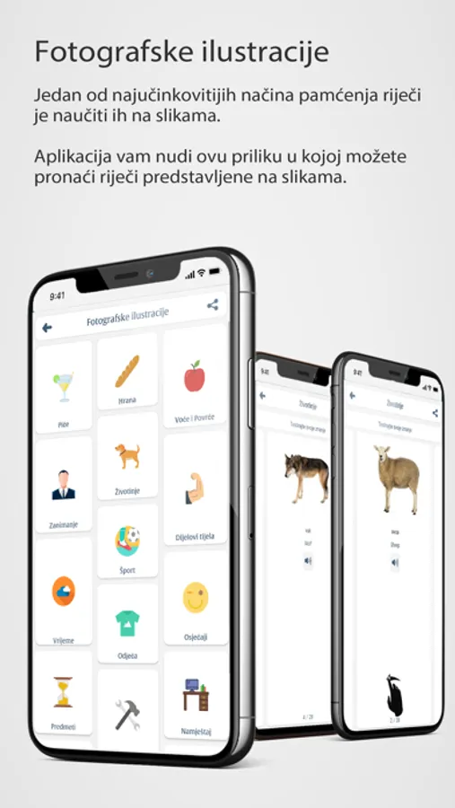 Jedan od najučinkovitijih načina pamćenja riječi je naučiti ih na slikama. Aplikacija vam nudi priliku da pronađete riječi ilustrirane slikama.