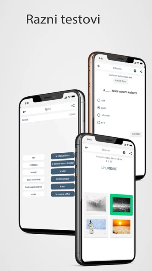 Testirajte svoje znanje iz različitih vrsta testova koje aplikacija nudi, kao što su: povezivanje riječi koje imaju isto značenje, pronalaženje točnog odgovora sa slike, prijevod riječi ili rečenice, preslušavanje rečenice i pisanje, izgovaranje rečenice koja pojavljuje se i više.