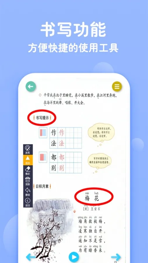 【4】画笔功能,全屏涂鸦让学习更加的有趣让学习更加高效率。完全同步最新发行教材,绝无缺漏页现象。