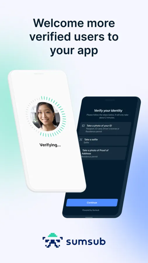 This application provides you with a real-time identity verification experience. Sumsub’s all-in-one verification platform secures every step of the customer journey. With Sumsub’s customizable KYC, KYB, KYT, and AML solutions, you can orchestrate your verification process, welcome more customers worldwide, speed up onboarding, reduce costs and steer clear of digital fraud.