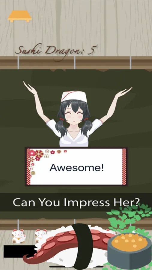 - Can you impress the chef? After each game, win or lose, you'll receive a comment from the expressive female sushi chef. Try your best to make her proud as she has a lot that she can say about your performance!