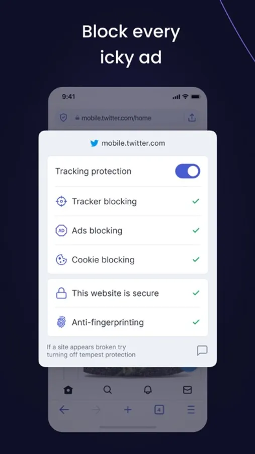 Tempest is a fast, secure and private browser that puts you in control of your personal data online. With Tempest, you aren’t tracked, profiled, fingerprinted or followed by targeted ads when you’re navigating the Internet.