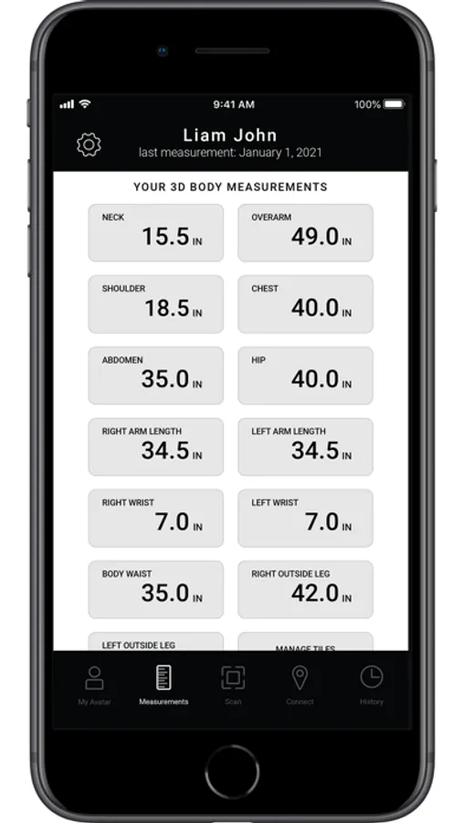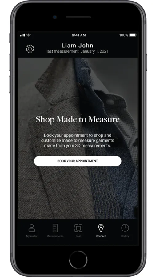 Scan yourself with our 3D measuring technology to shop and customize made to measure garments. Liam John combines 3D body scanning technology with art and tradition of craftsmanship to deliver the very best fit and feel.