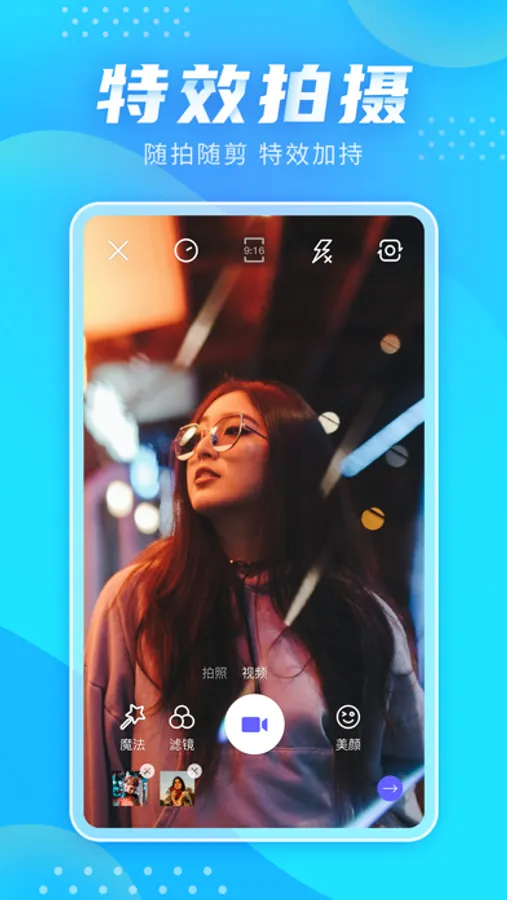 没有合适的怎么办?打开拍摄功能就地取材!美颜滤镜、风格化特效一键叠加,更多精彩等你来挖掘!"
