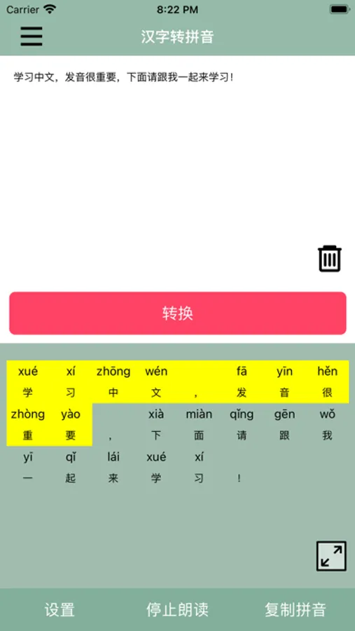支持简体汉字和繁体汉字转换拼音码,用户可自定义转换格式,可以逐字发音朗读普通话发音,是学习中文普通话拼音的最佳工具。