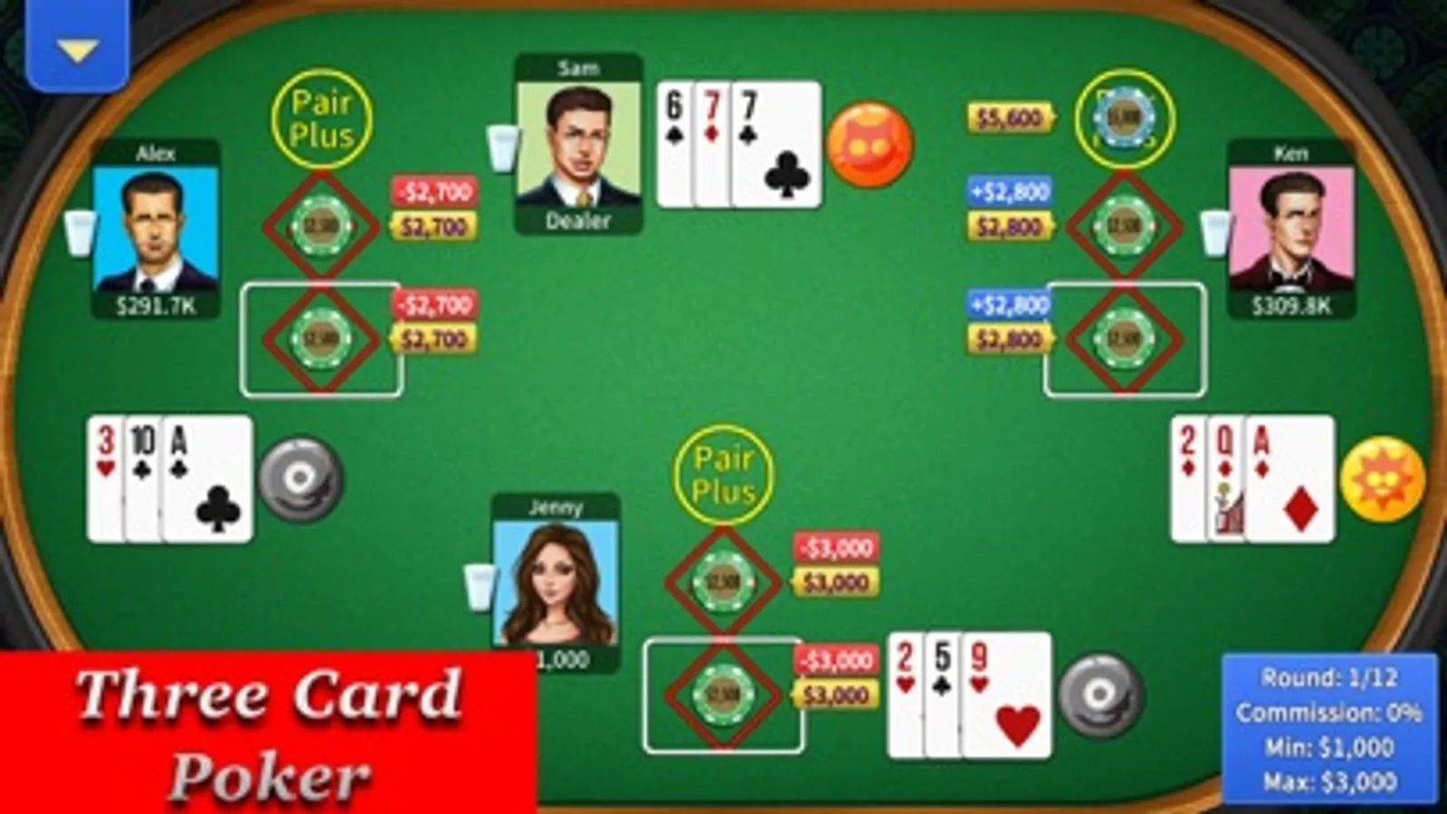 Three card poker also known as triple card poker/teen patti is an easy and fun card game.