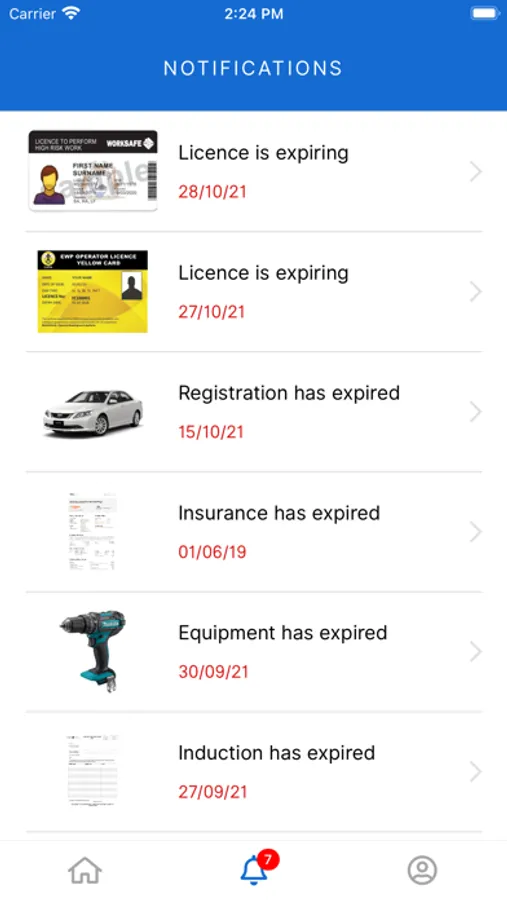 * Notifcations can be applied to provide reminders in the weeks and days before a particular document/card expiry date.