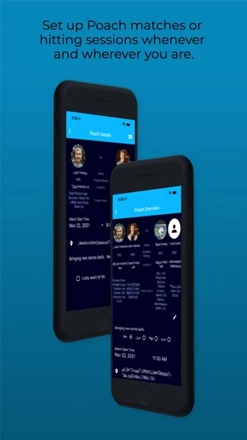 Poach is an easy way to find tennis players in your area and at your skill level. Schedule hitting sessions or Poach your opponents to challenge them to a match anytime, anywhere. Watch your Poach rating rise as you improve your tennis game. Track your matches and add other players to your NETwork to follow their matches.