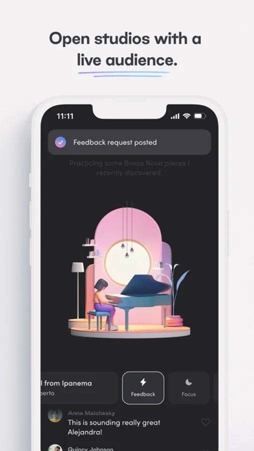 A space for musicians of all levels to meet up, practice together, and track personal progress. Share work-in-progress and celebrate moments of your artistic journey. Open a virtual practice room, meet new practice buddies, and upload practice videos to get feedback from your community.