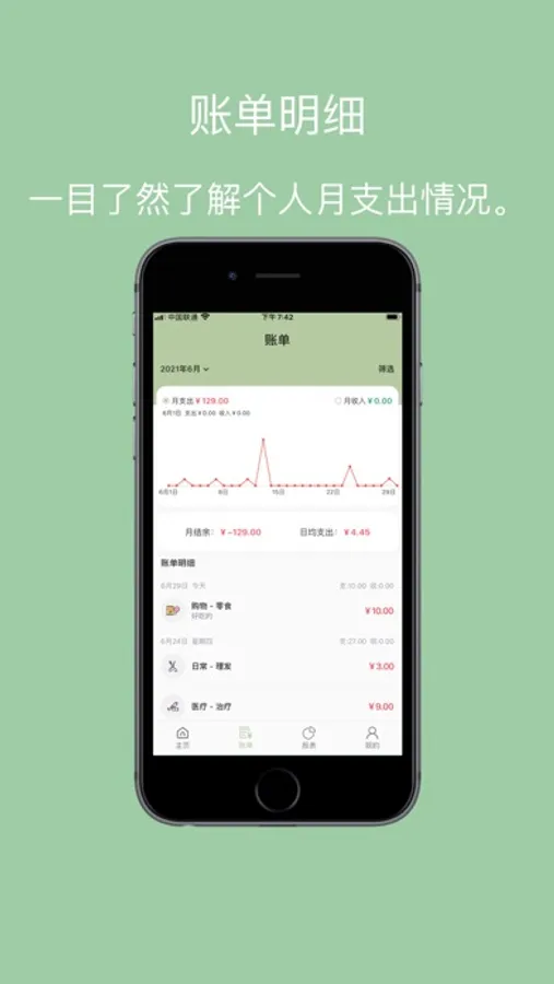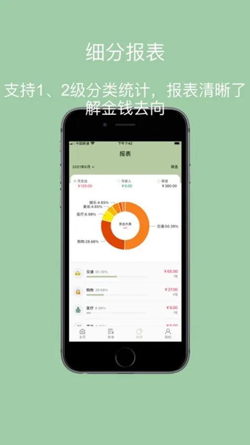 支持1级分类、2级分类各种报表统计,轻松知道钱的去向,及时修正消费习惯。