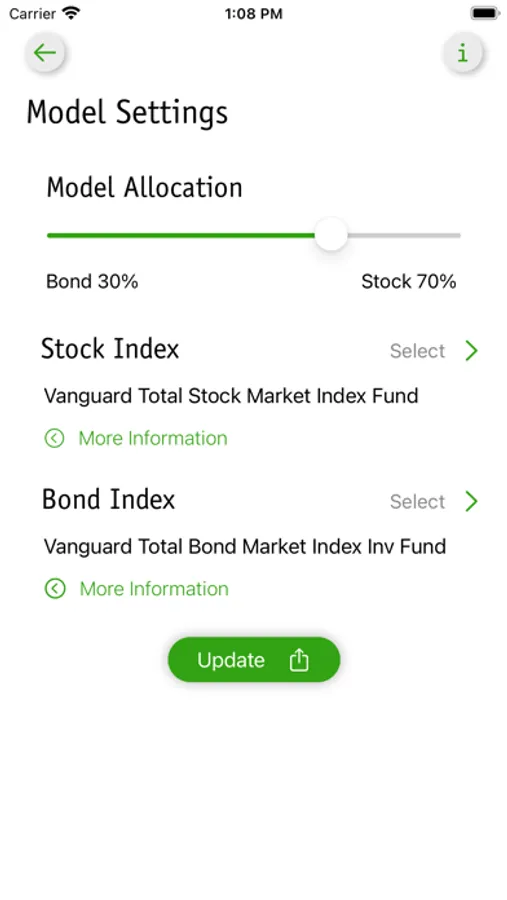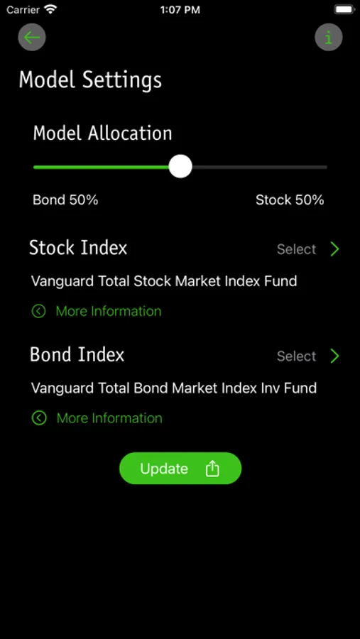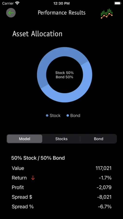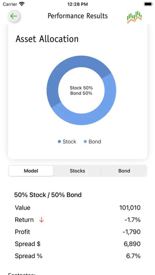 Your Returns are then compared to the Model's Returns based upon your Asset Allocation between Stocks and Bonds.