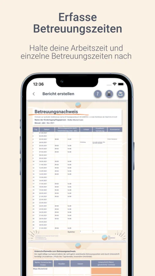 > Erfasse Betreuungszeiten minutengenau für dich und deine Kinder und erstelle PDFs oder Excels zum Versand ans Amt.