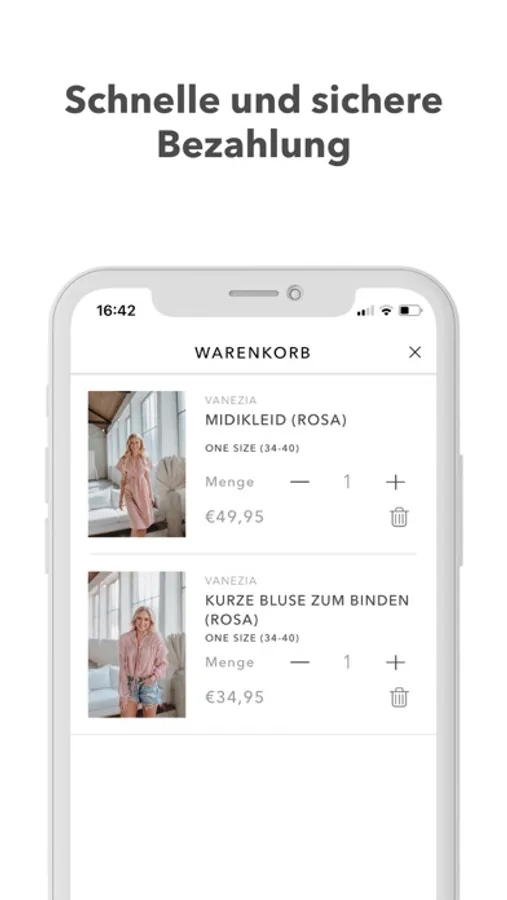 Dein persönliches VANEZIA Shopping-Erlebnis mit einer großen Auswahl verschiedener Looks und Artikel, mit zahlreichen Zahlungsmöglichkeiten und schneller Premium-Lieferung mit DHL.