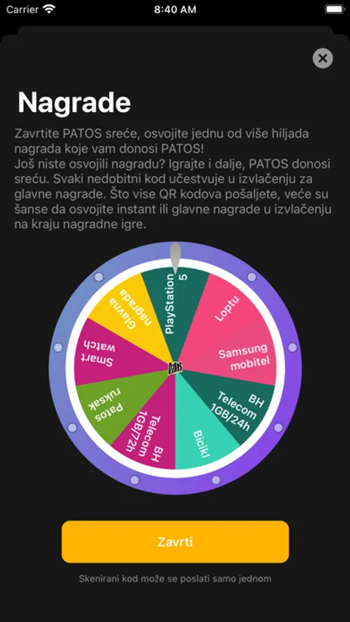 Patos Čipsaj i Osvajaj je aplikacija zabavnog i nagradnog karaktera namijenjena zabavu i učešće u Patos nagradnim igrama i dodijelu sjajnih nagrada vjernim Patos kupcima.