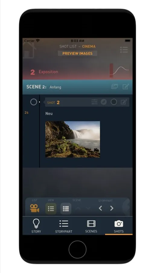 With STORY & FILM you divide your story into STORYPARTS, SCENES and SHOTS. This is a common subdivision to keep track of the narrative structure and connections.