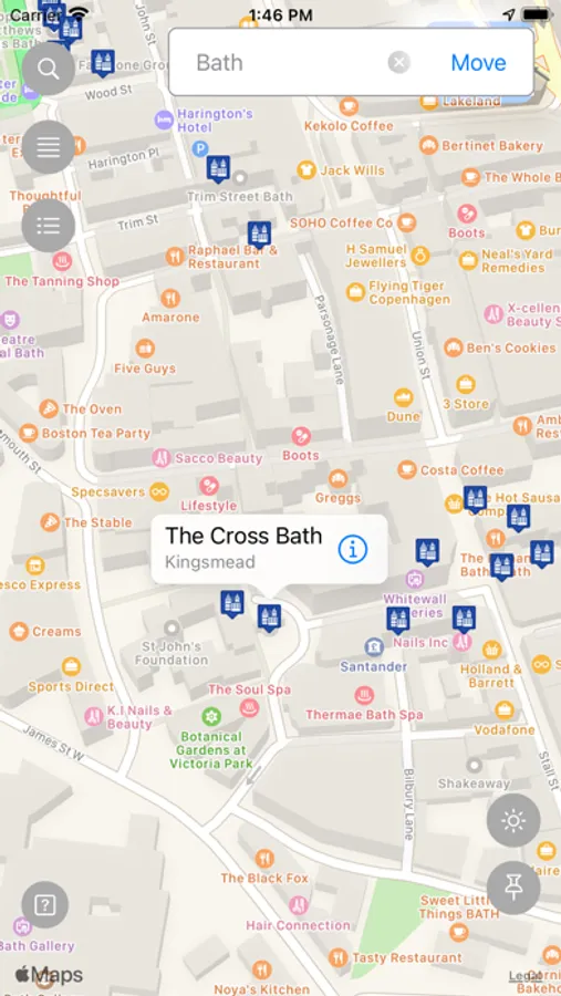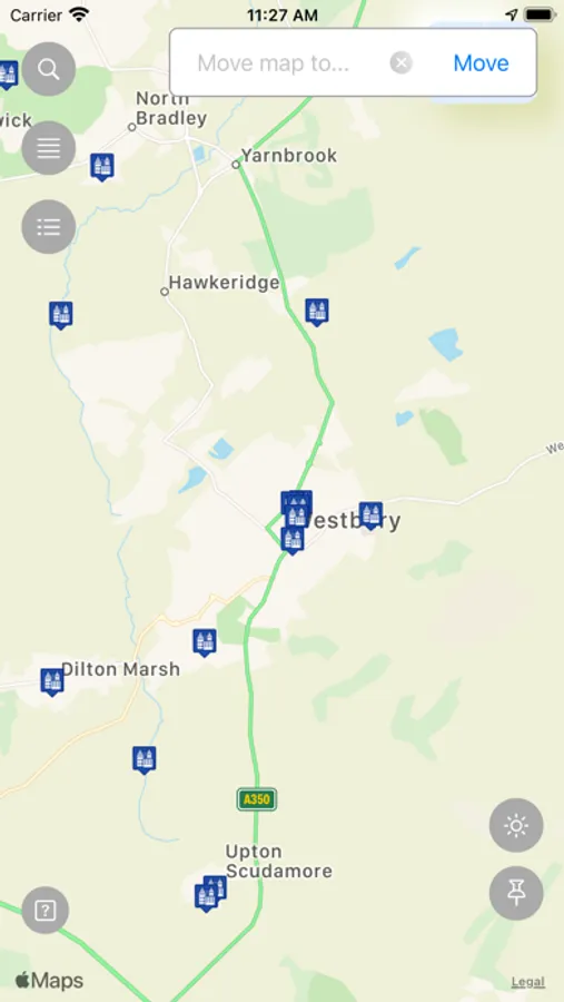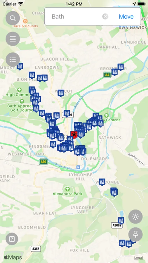 Historic Sites: England presents the standard Apple Map, with sites in the Historic England list marked on the map at their location. For any locale you choose or for the area around your current location, you can see what Historic sites are nearby.