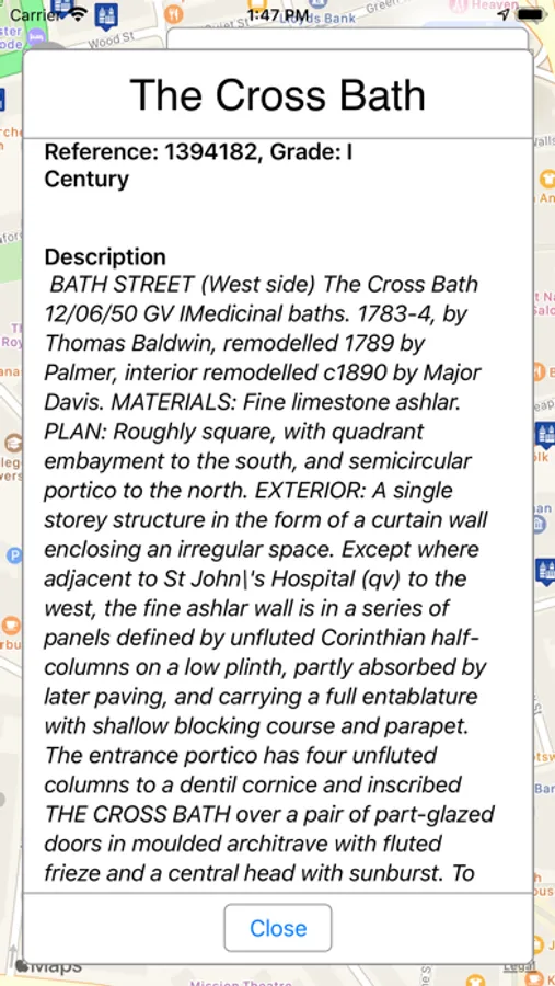 For each site you can see the Historic England description of the site. For Grade II, this description is truncated keep the size of the database to a level usable on iOS. To see the full description for a Grade II site, you can go from the app to the Historic England page for that site.