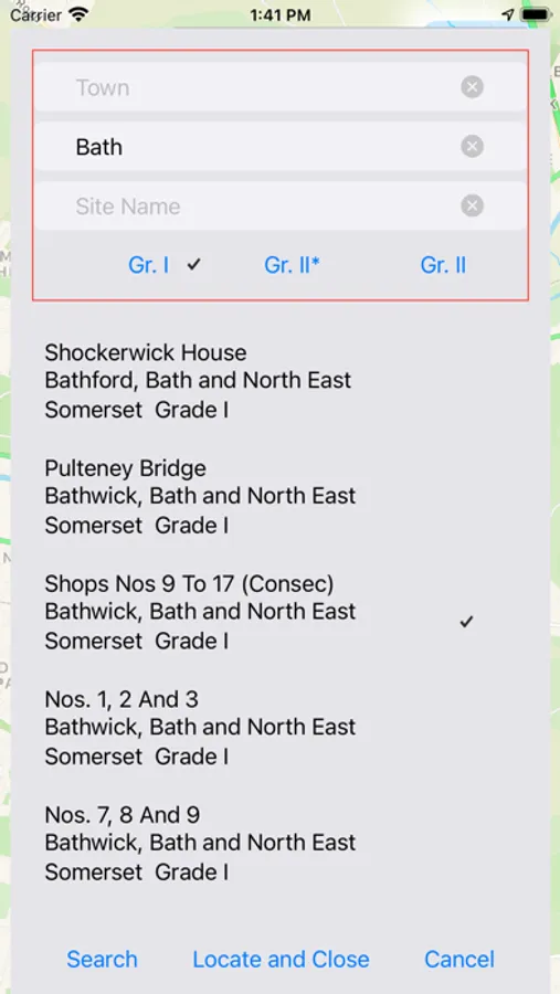 "Search and Locate" mode: Search for Historic sites by state, by city or by name, or any combination of those three. You'll get a list of all the sites matching your search criteria. From that list you can see more information about a site, or you can tap a site and the map will center itself on the site you selected.