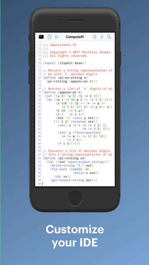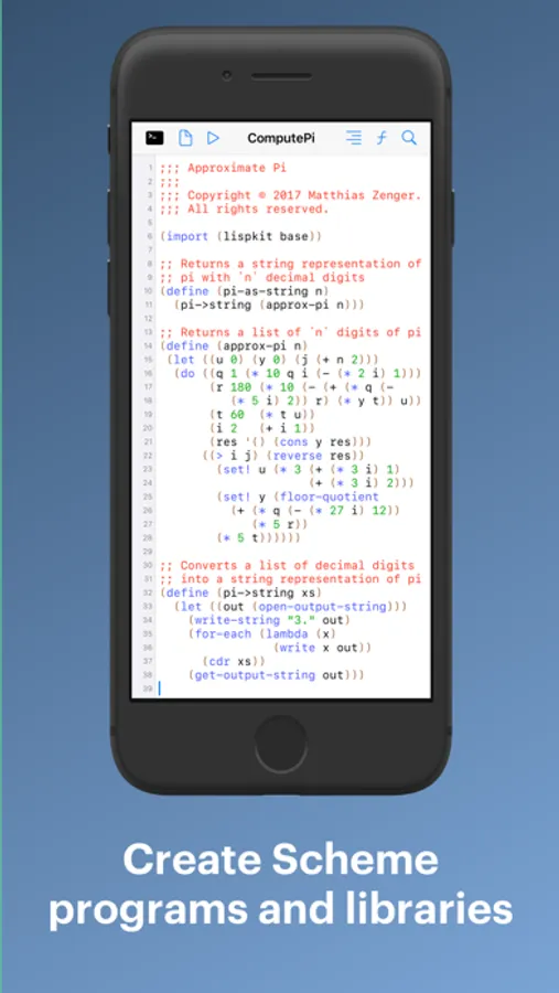 LispPad Go is a simple, lightweight, integrated development environment for developing and running Scheme code on iOS. The language supported by LispPad Go is based on the R7RS standard of the Scheme programming language. LispPad Go provides the following components: