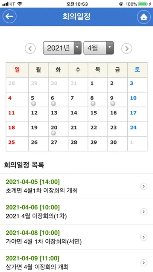 - 월별로 회의내용들을 확인할 수 있고, 회의에 참여 또는 미참여를 전송하여 회의에 필요한 내용들을 미리 준비할 수 있습니다.