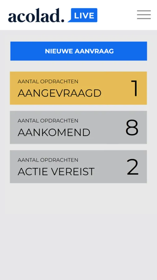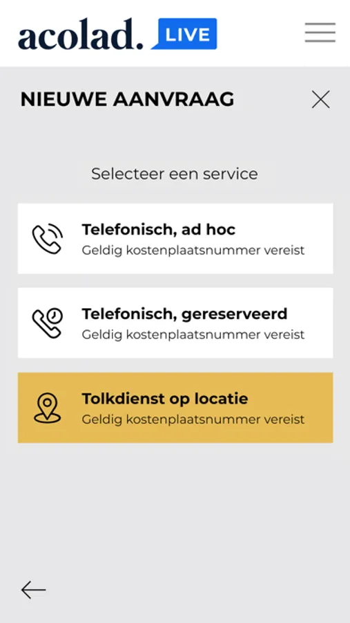 Als klant beheert en monitort u uw tolkaanvragen in een beveiligde omgeving conform ISO 27001 (Informatiebeveiliging) in de app. Zonder tussenkomst van het Callcenter wordt u rechtstreeks en binnen 3 minuten doorverbonden met de tolk. Acolad Live App voor alle typen tolkdiensten, zowel ad hoc als gereserveerd. Om deze app te gebruiken dient u over een gebruikersaccount te beschikken. Hulp nodig? Ga naar interpreting.livewords.com.