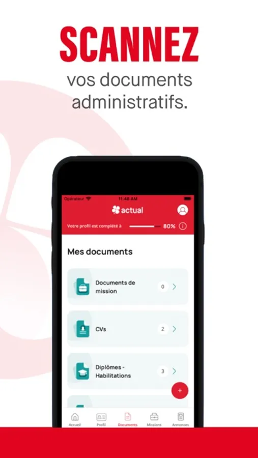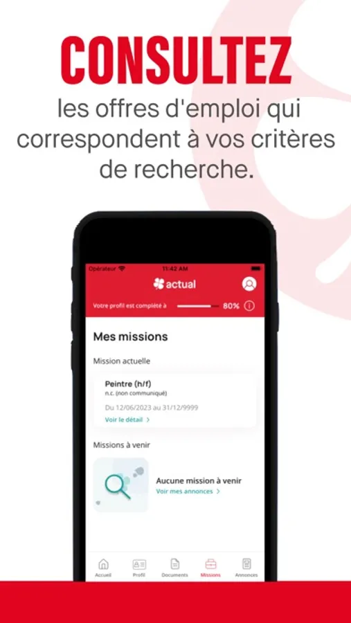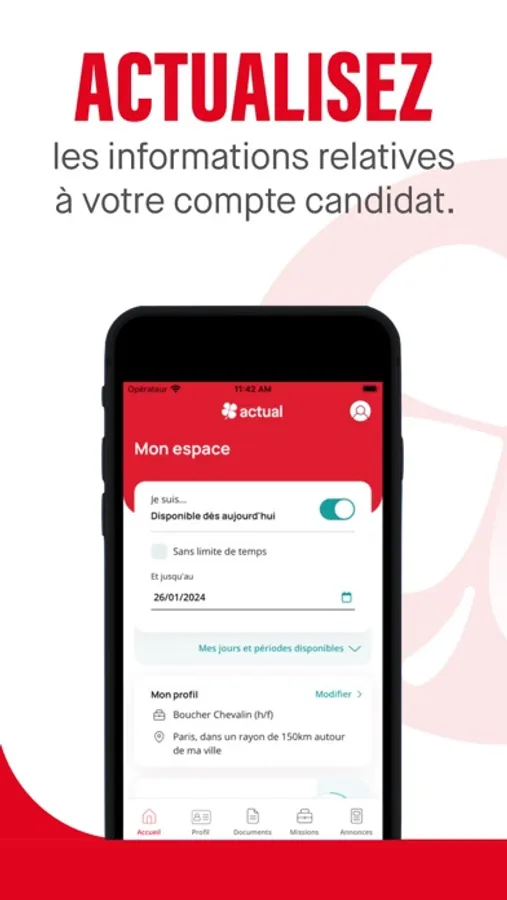Trouvez vos prochaines missions Interim, ou votre prochain emploi CDD / CDI en quelques clics ! Construisez votre travail avec my actual en gérant vos candidatures et vos missions en toute simplicité depuis votre smartphone :