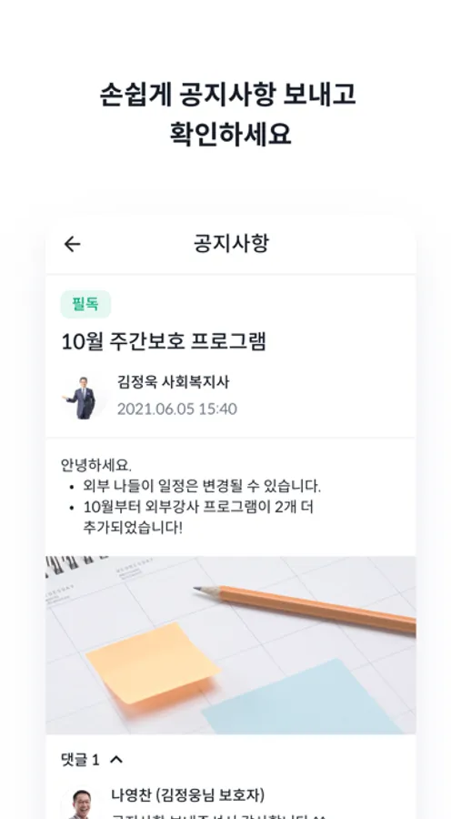 보호자들에게 알려야 하는 사항이 있나요? 사항을 알리고 나서 확인을 위해 연락을 하시느라 불편하시지 않았나요? 요양원/주야간보호센터에서 수급자의 보호자에게 알려야 하는 모든 내용을 공지사항에 작성하세요. 보호자에게 알림이 가기 때문에 따로 연락할 필요가 없어요.